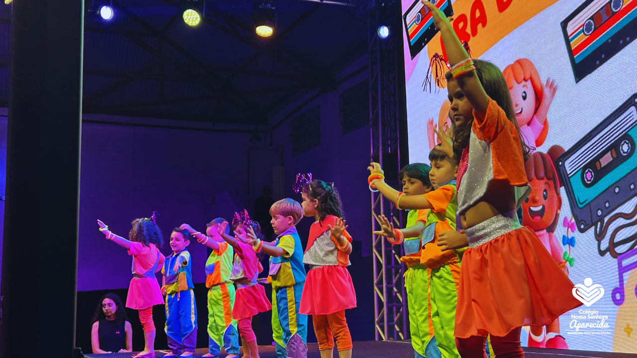 O tema escolhido para a festa de encerramento — As Eras da Comunicação — brindou a plateia com um espetáculo criativo e cuidadosamente preparado. As turmas mergulharam em uma jornada musical que atravessou décadas, resgatando memórias afetivas e aproximando gerações.