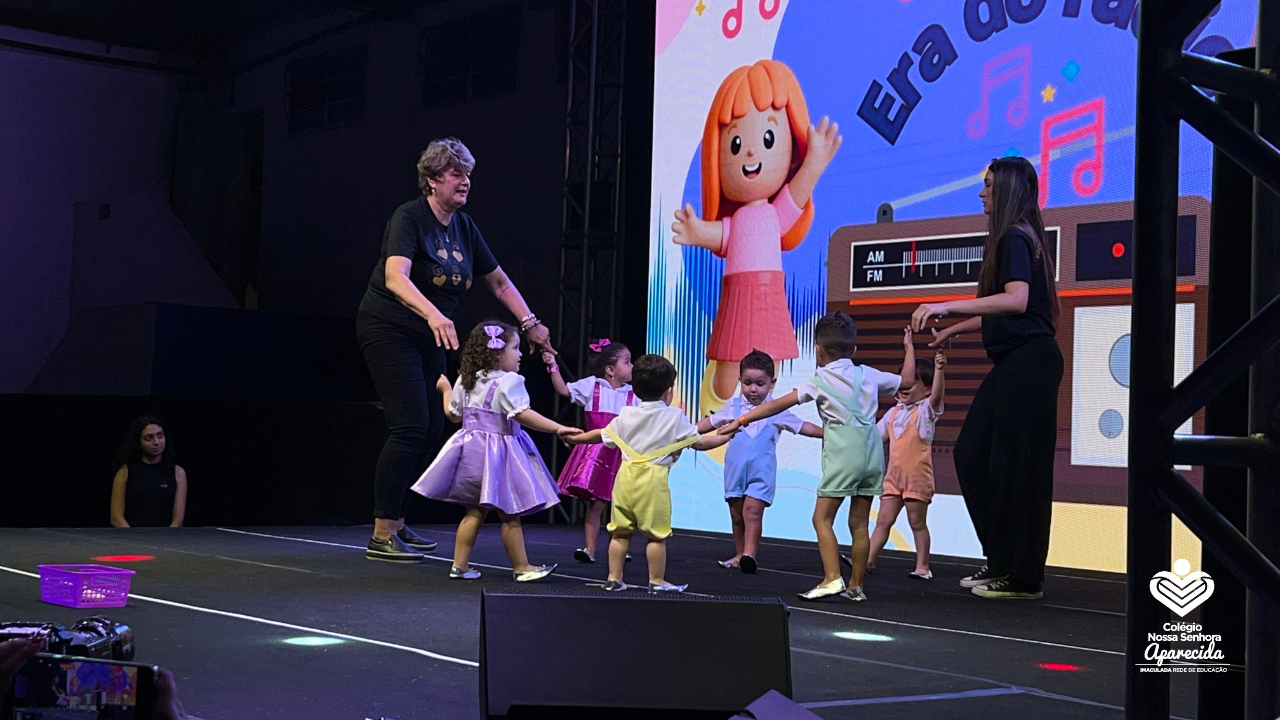 Os pequenos avançaram para a Era do Vinil, que marcou as décadas de 1950, 1970 e início dos anos 1980. O charme dos discos de vinil — com seus chiados, sulcos e capas icônicas — reacendeu lembranças nostálgicas na plateia. A vitrola, o toca-discos e o brilho das músicas que embalavam bailes e reuniões de família ganharam vida no palco, com figurinos encantadores e coreografias bem ensaiadas.